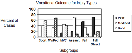 The authors found that neither positive CT scans or brief loss of consciousness appeared to be significant factors in predicting neuropsychological status or vocational outcome. Vocational outcome did not differ between males vs. females, prior concussion vs. no prior concussion, and psychiatric history vs. no psychiatric history. Interestingly, litigation also had no effect on vocational outcome. There was a significant difference in vocational outcome when comparing injury types. Those injured in falls, or by falling objects had significantly worse vocational outcomes than did those injured in motor vehicle collisions. The chart below illustrates: